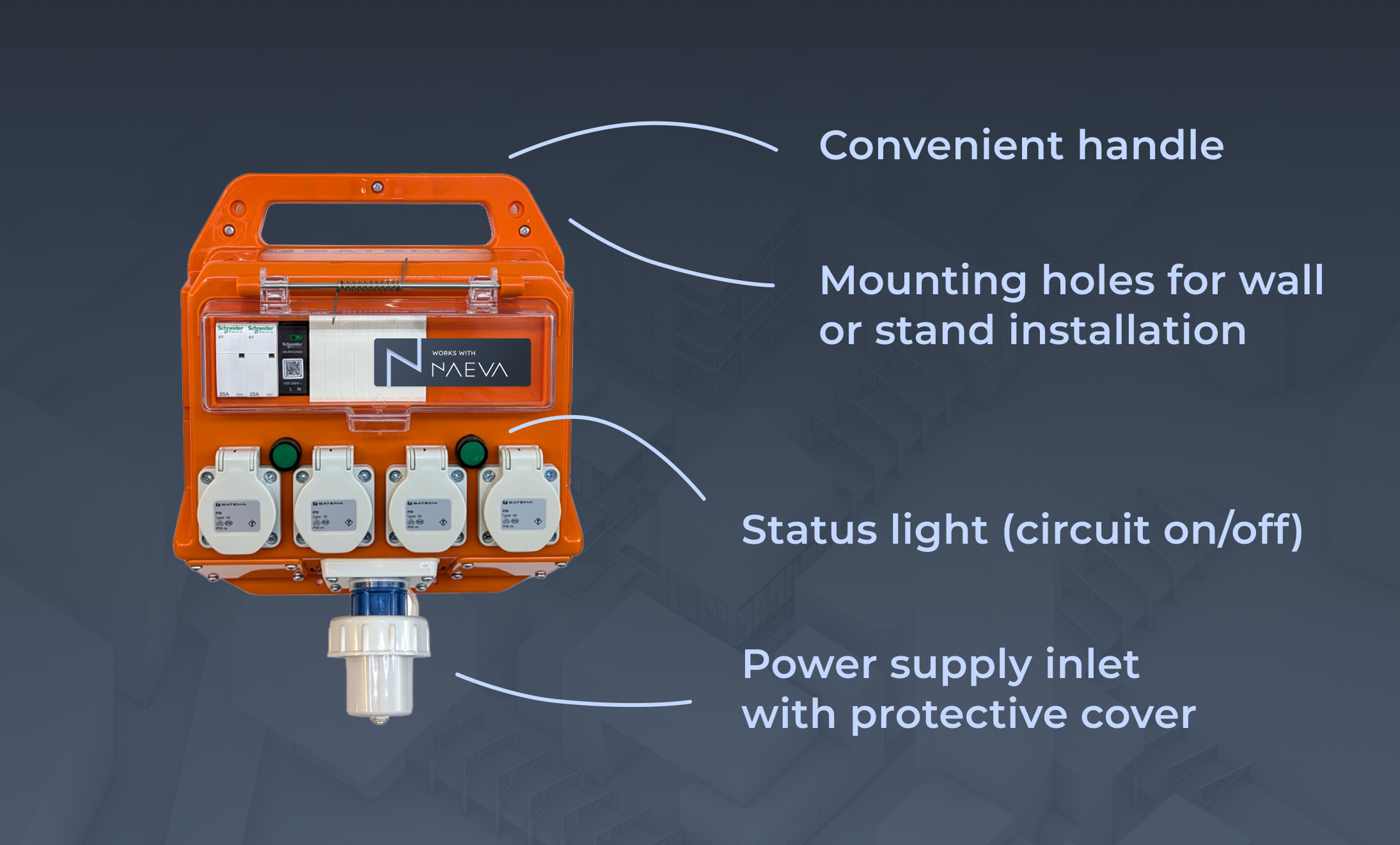 Meet SwitchBox 16A - A compact, portable control unit with 4x SCHUKO sockets. It gives you full control over power consumption on site. Easily switch off lighting, heating, or fans when they’re not needed — directly from the NAEVA platform.(2 pairs at 16 A / 230 V, max total load 3.7 kW)